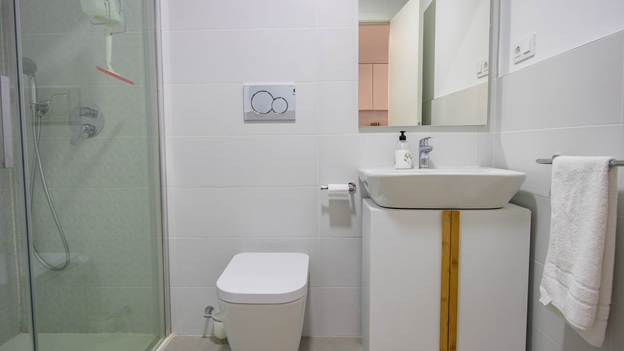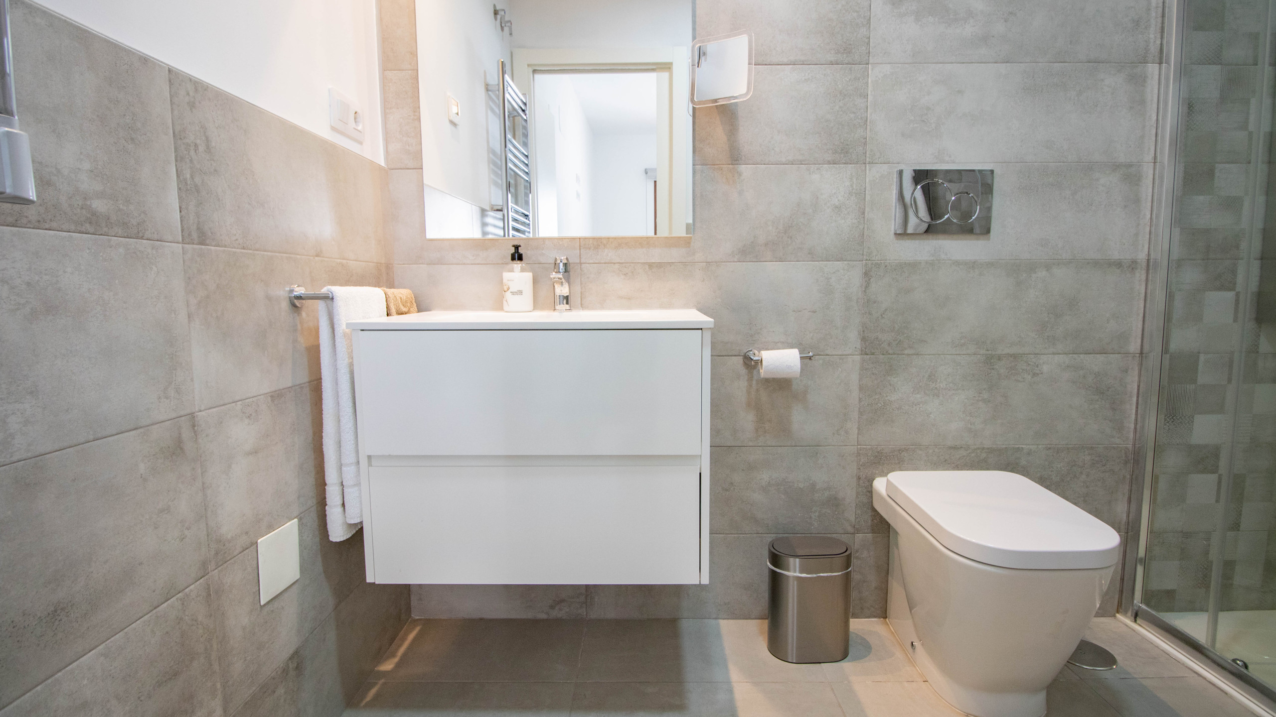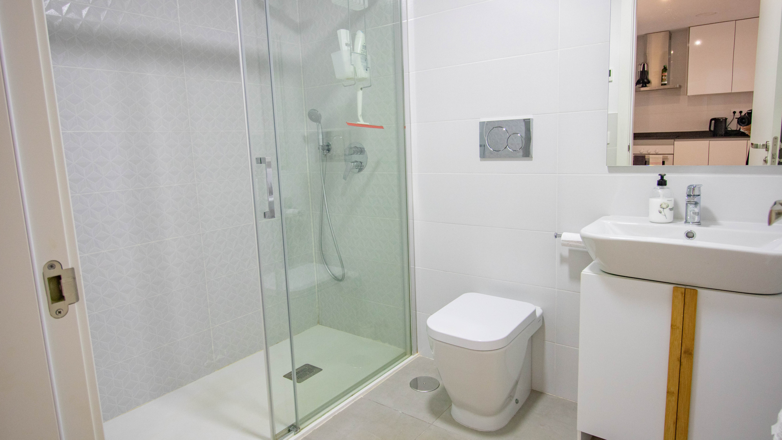 De woning beschikt over twee slaapkamers en twee volledige badkamers - waarvan een en-suite - en een lichte woon-eetkamer met directe toegang naar buiten. De open keuken, modern en volledig uitgerust, biedt alles wat nodig is voor een comfortabel en praktisch verblijf.