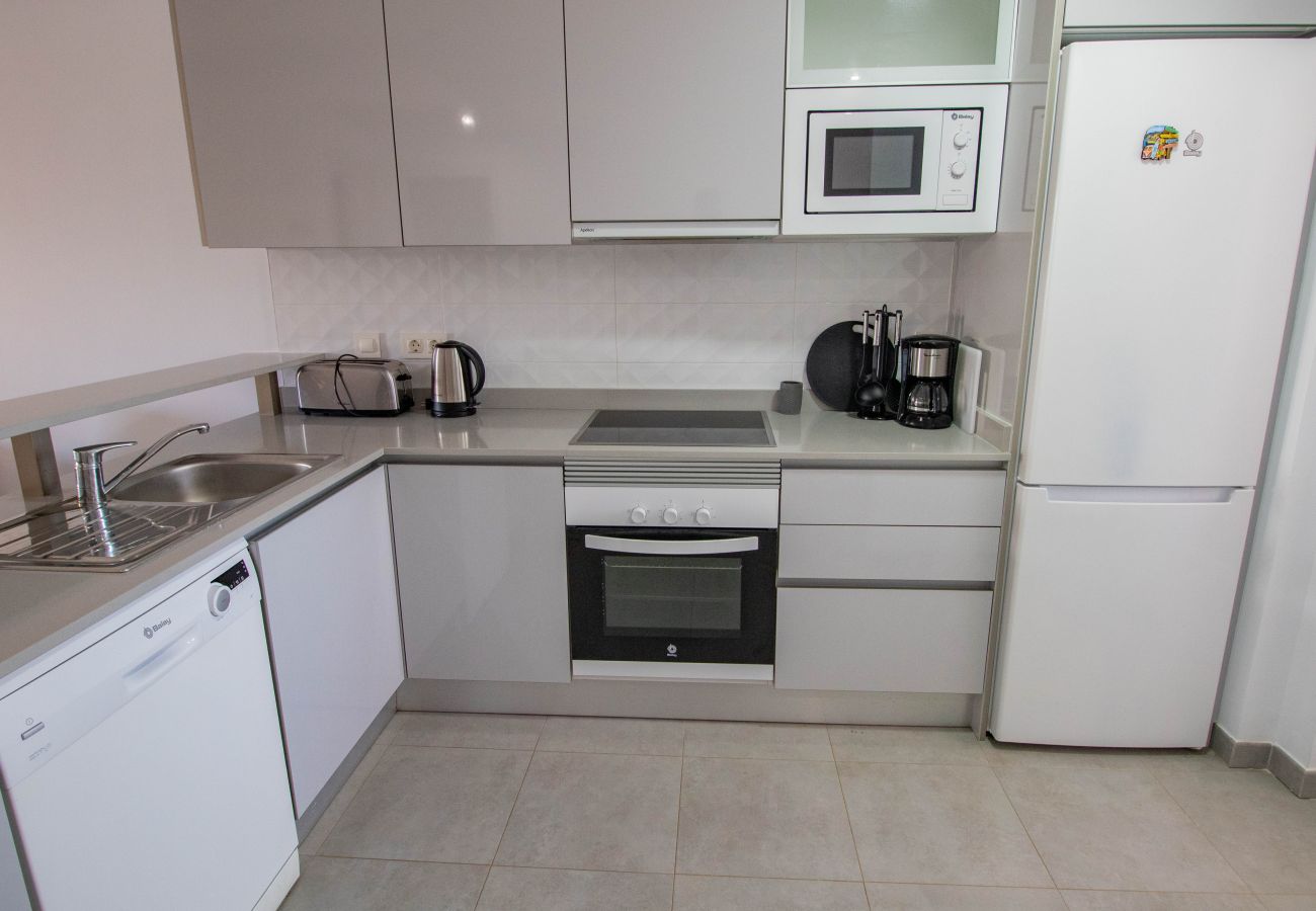 El apartamento cuenta con un amplio y luminoso salón comedor con cocina integrada, ideal para relajarse en familia o con amigos. Gracias a su diseño abierto y grandes ventanales, la luz natural llena cada rincón del espacio.