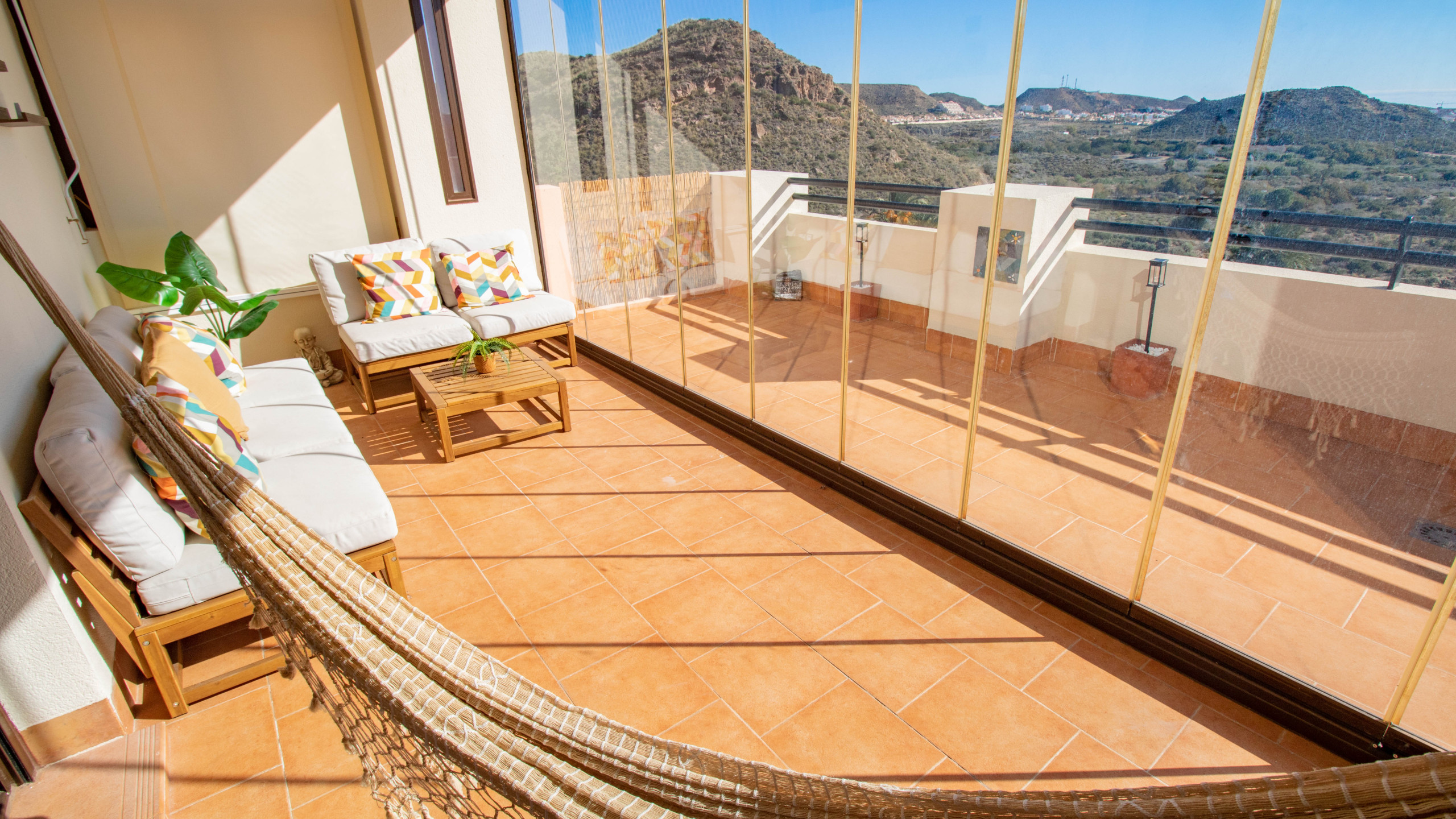 El punto fuerte del apartamento es su gran terraza con zona acristalada, perfecta para relajarse en cualquier momento del día. Toda la terraza ofrece vistas al mar, creando un ambiente agradable y relajante para desayunos, comidas o simplemente descansar al aire libre.