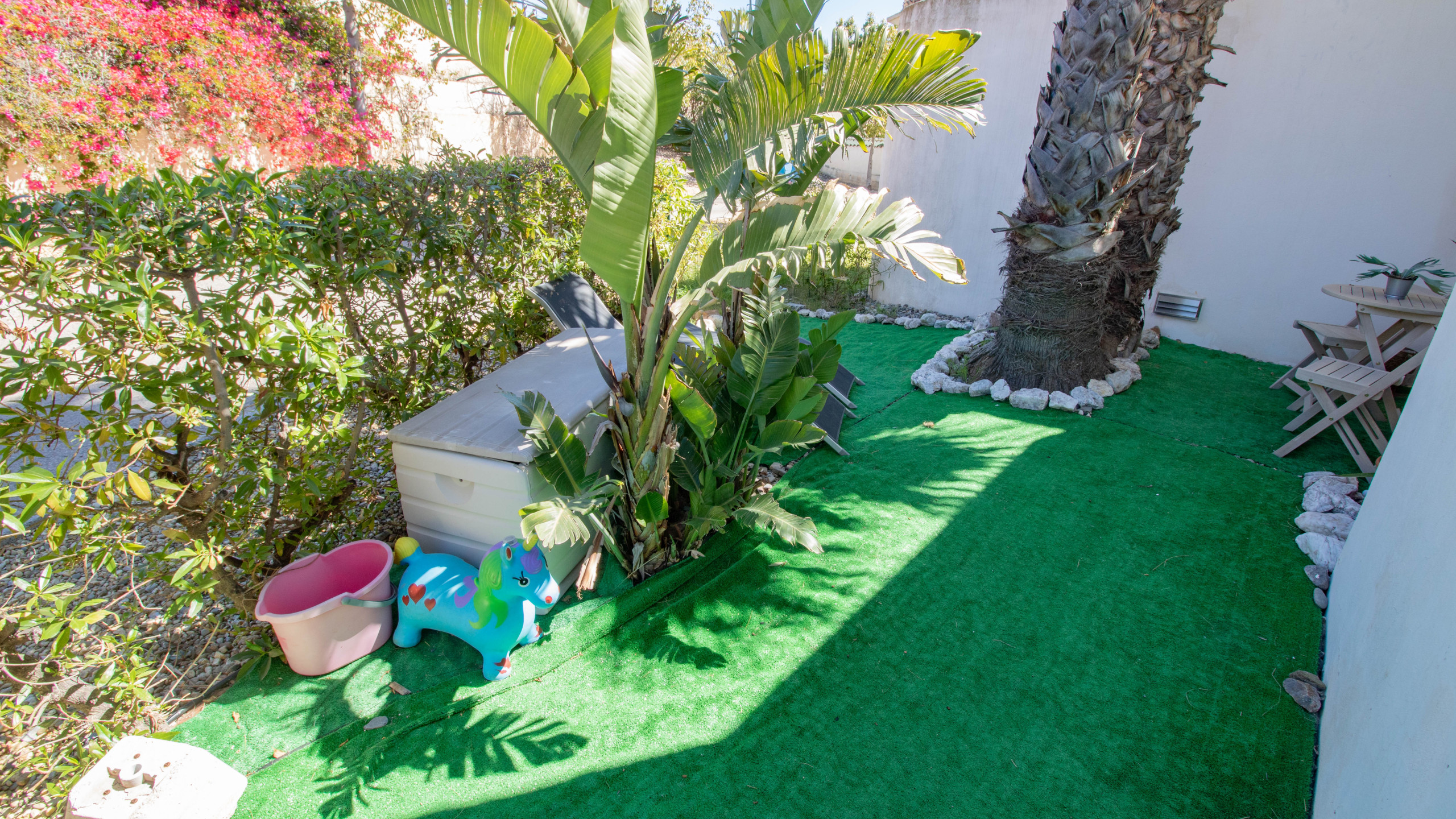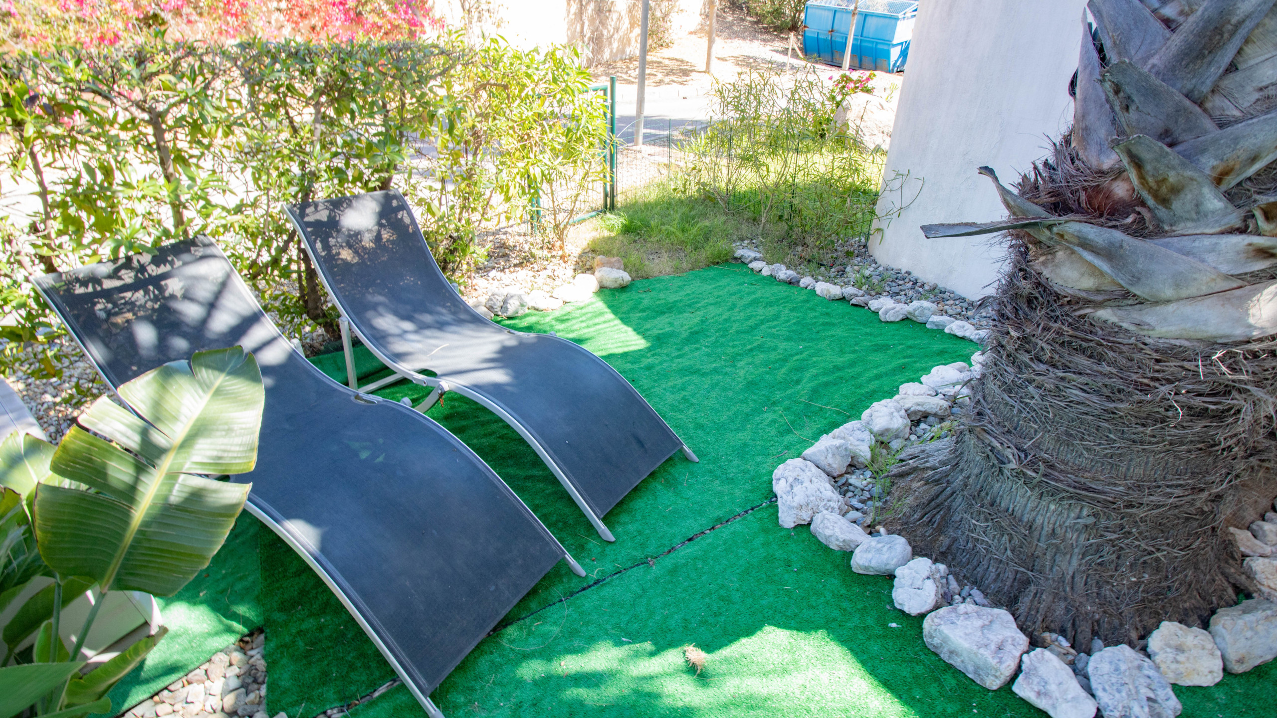 En el exterior, dispone de una zona trasera privada, perfecta para disfrutar de comidas al aire libre o momentos de relax, además de un pequeño porche delantero que aporta un espacio adicional para descansar. En la parte superior, el bungalow ofrece un solárium privado, ideal para tomar el sol y aprovechar el buen clima durante todo el año.