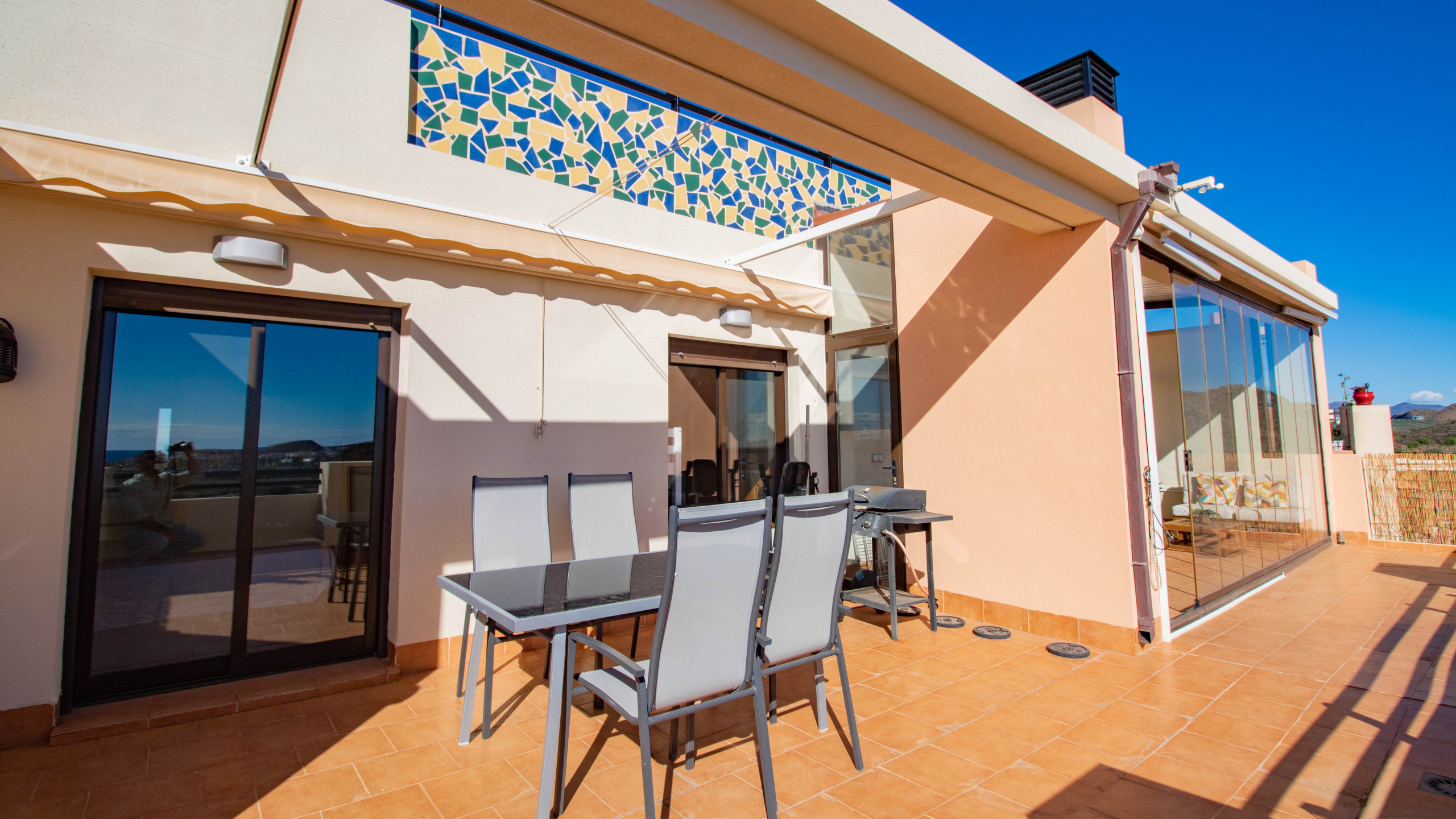 Le point fort de l'appartement est sa grande terrasse avec zone vitrée, parfaite pour se détendre à tout moment de la journée. Toute la terrasse offre une vue sur la mer, créant une ambiance agréable et relaxante pour les petits-déjeuners, les repas ou simplement pour se reposer en plein air.