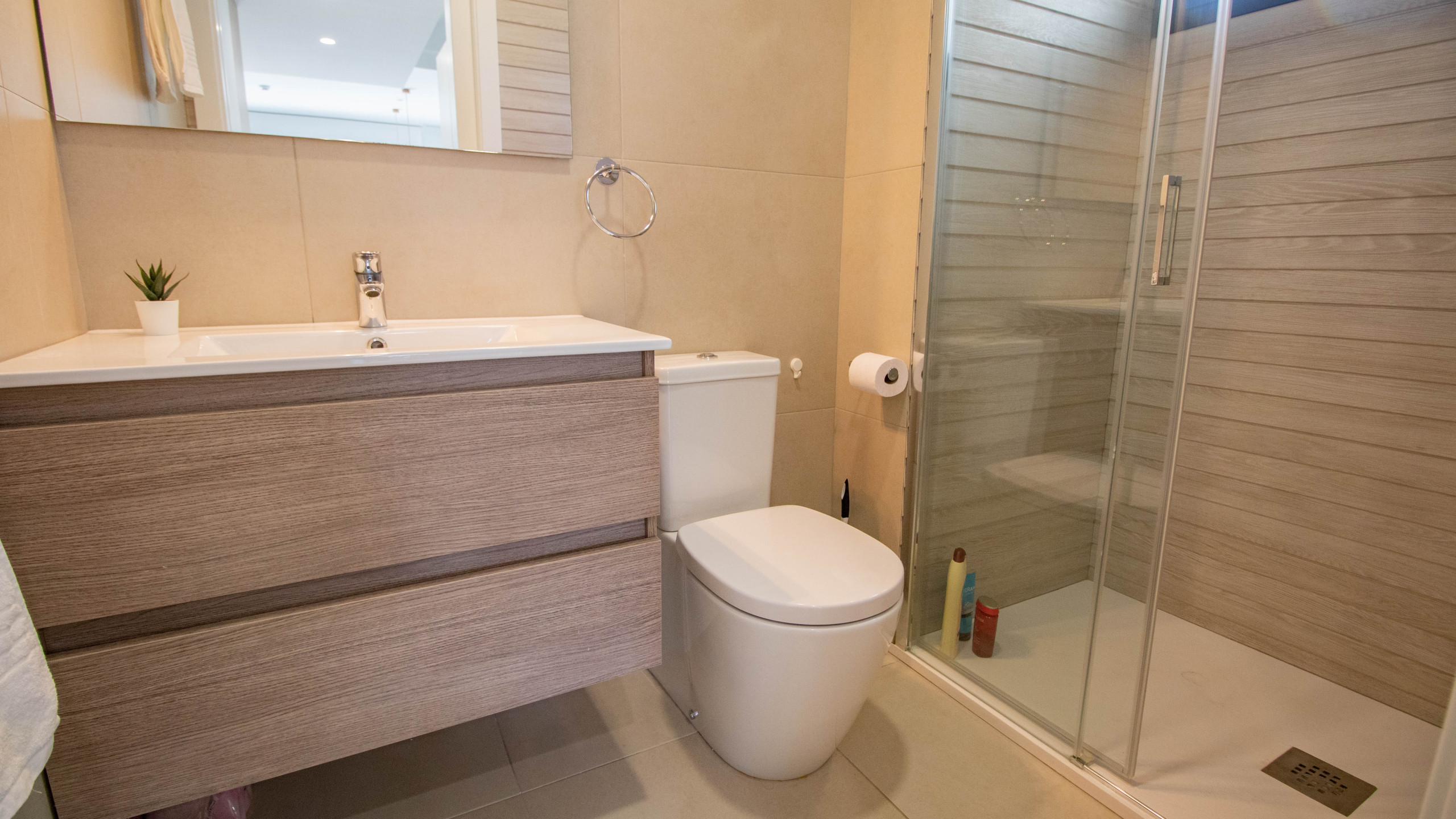 The property has three spacious bedrooms and three full bathrooms. On the ground floor, you will find a bedroom, a bathroom, a bright living-dining room and a fully equipped American kitchen, ideal for enjoying with family or friends.