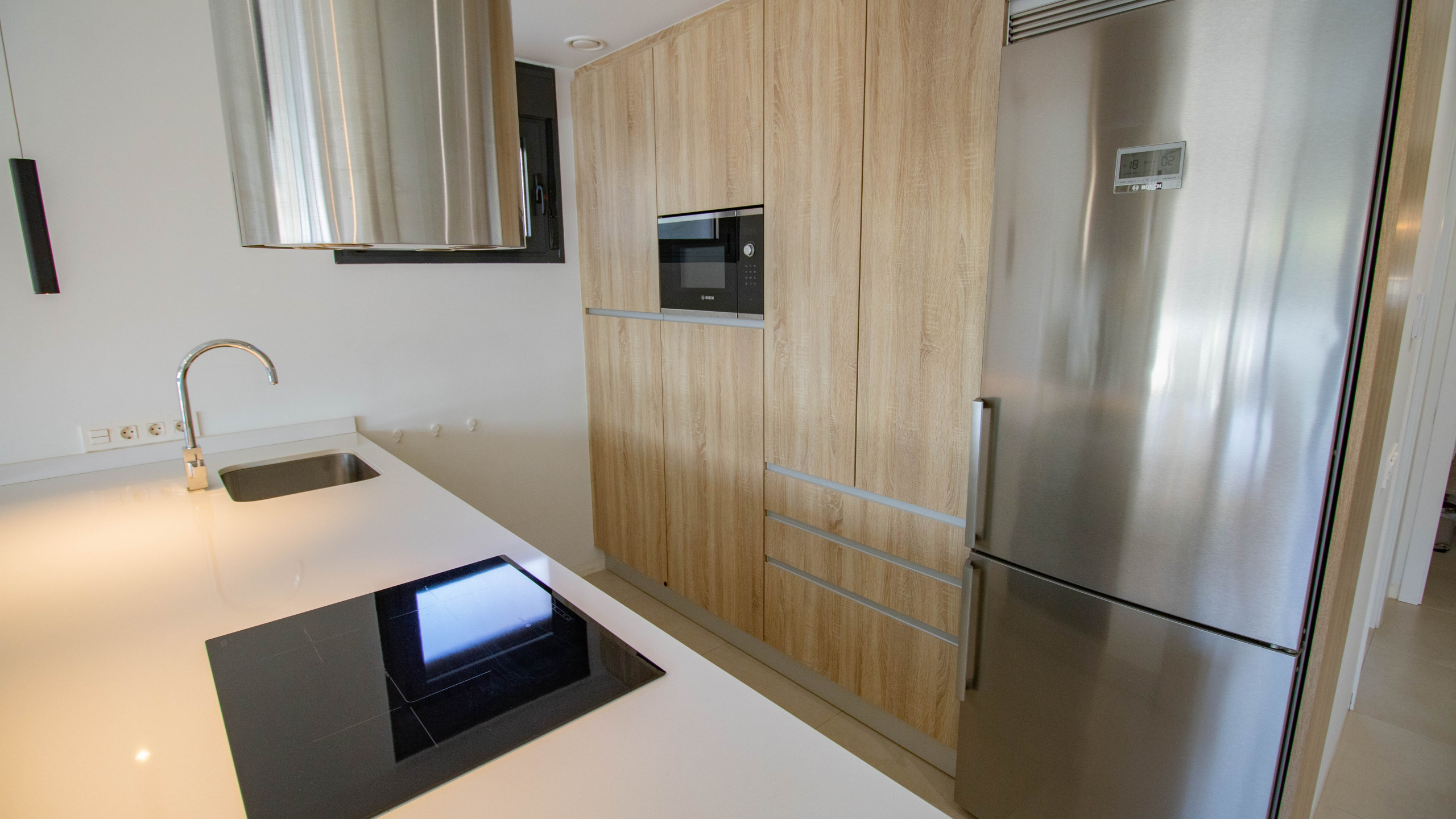 Кухня, совмещенная с залом, оснащена индукционной плитой, оборудовано холодильник, микроволновая печь, духовка, морозильная камера, посудомоечная машина, столовые приборы, кухонная утварь и кофеварка.
