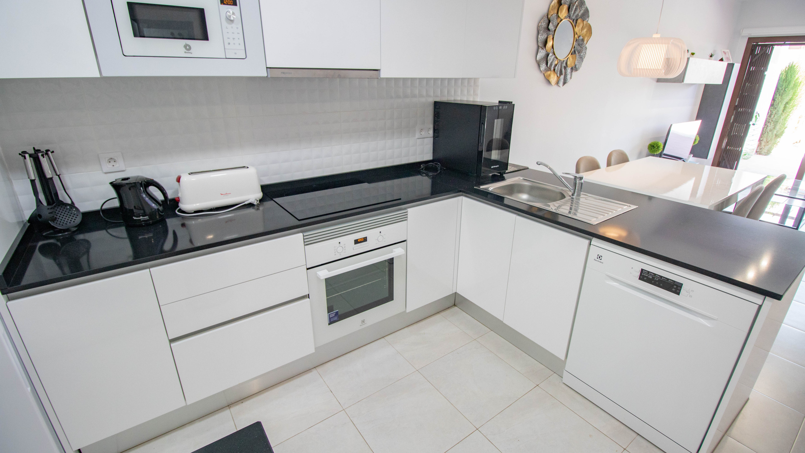Кухня, совмещенная с залом, оснащена плитой с керамическим покрытием, оборудовано холодильник, микроволновая печь, духовка, морозильная камера, посудомоечная машина, столовые приборы, кухонная утварь, кофеварка, тостер и Чайник.