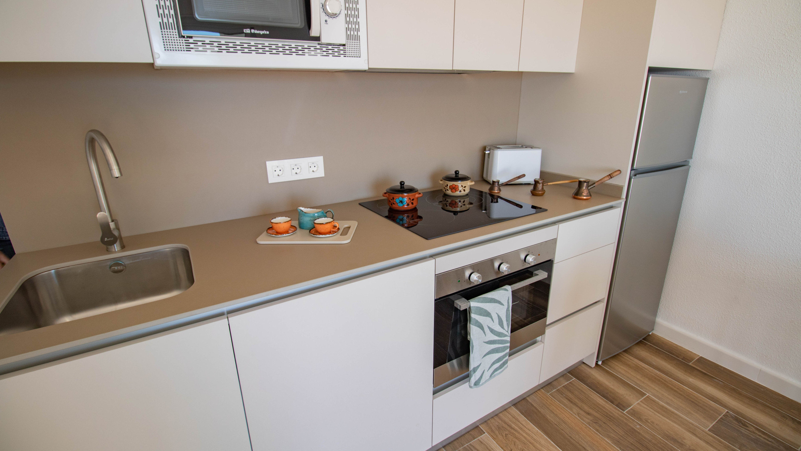 Кухня, совмещенная с залом, оснащена индукционной плитой, оборудовано холодильник, микроволновая печь, духовка, морозильная камера, столовые приборы, кухонная утварь, кофеварка и тостер.